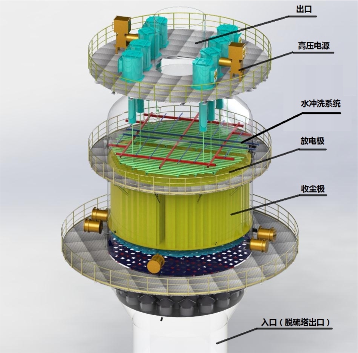 主要由殼體、進口煙箱、陰極系統(tǒng)、陽極板/管、水沖洗系統(tǒng)(循環(huán)水系統(tǒng))、高壓電源、出口煙箱、氣流分布板、電控系統(tǒng)等組成。